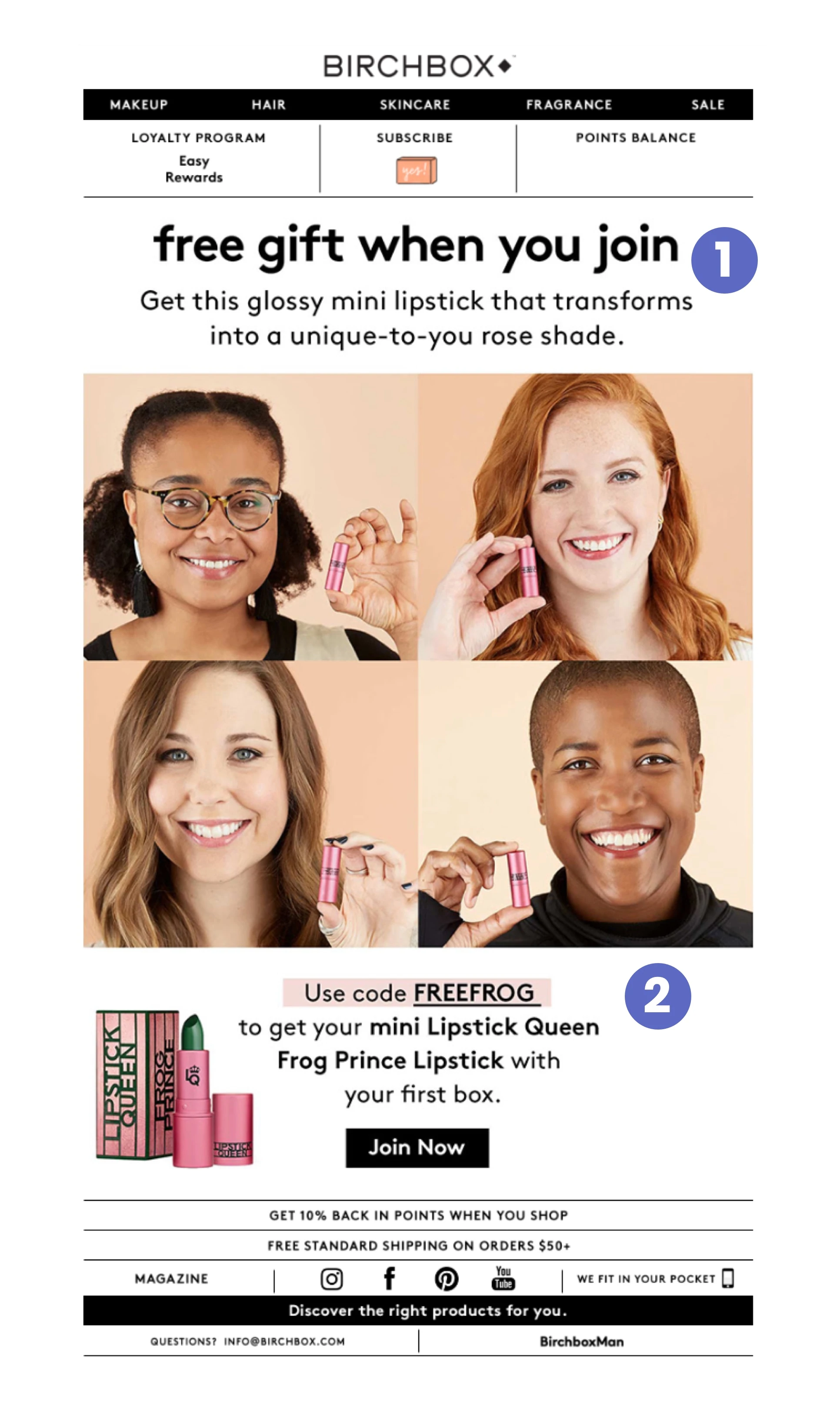 Preview text: “Join today and get a free mini Lipstick Queen Frog Prince Lipstick. Birchbox”