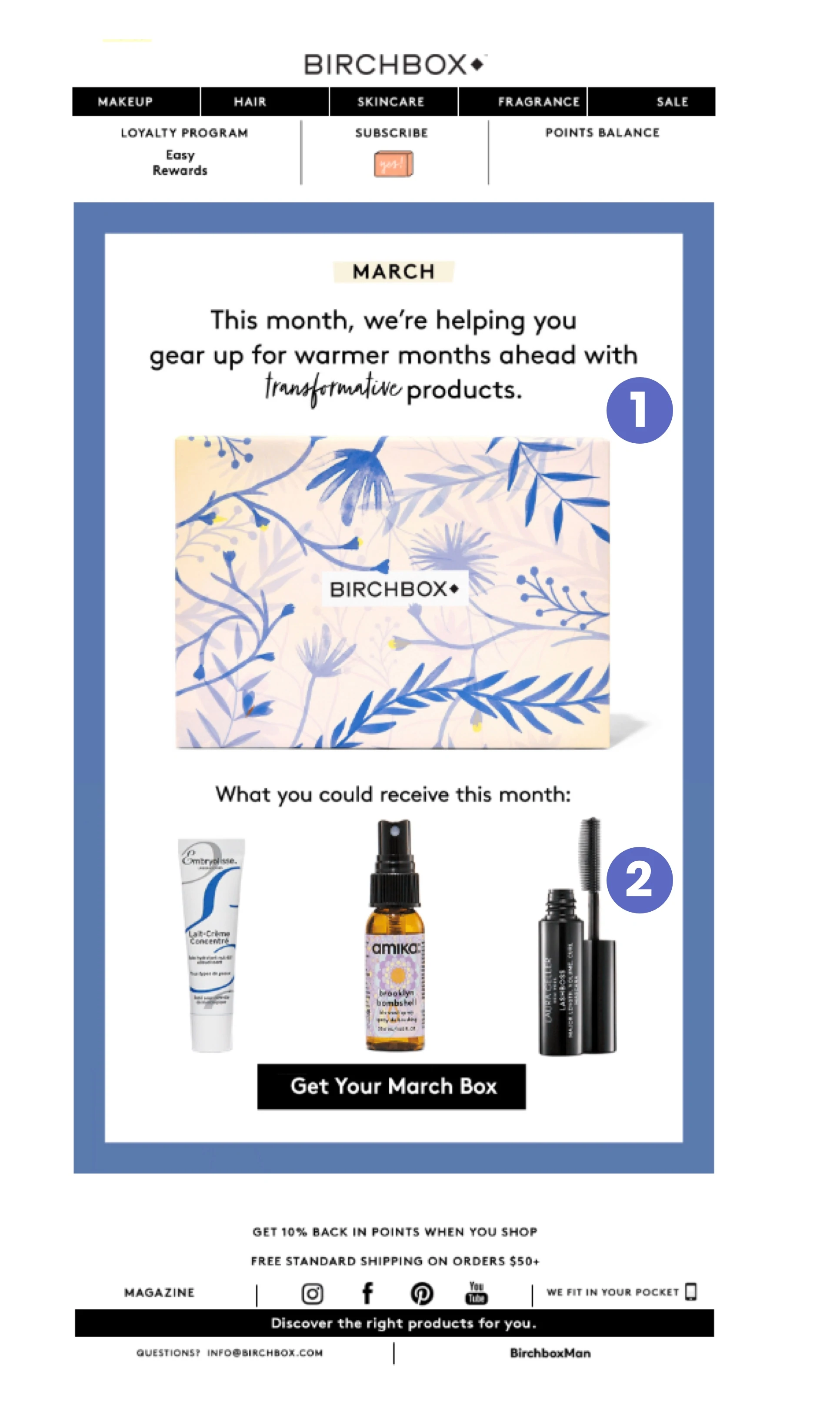 The products are nicely lined up just outside the box and partially point to the copy above. Once again, there is a specific call to action in “Get Your April Box.”