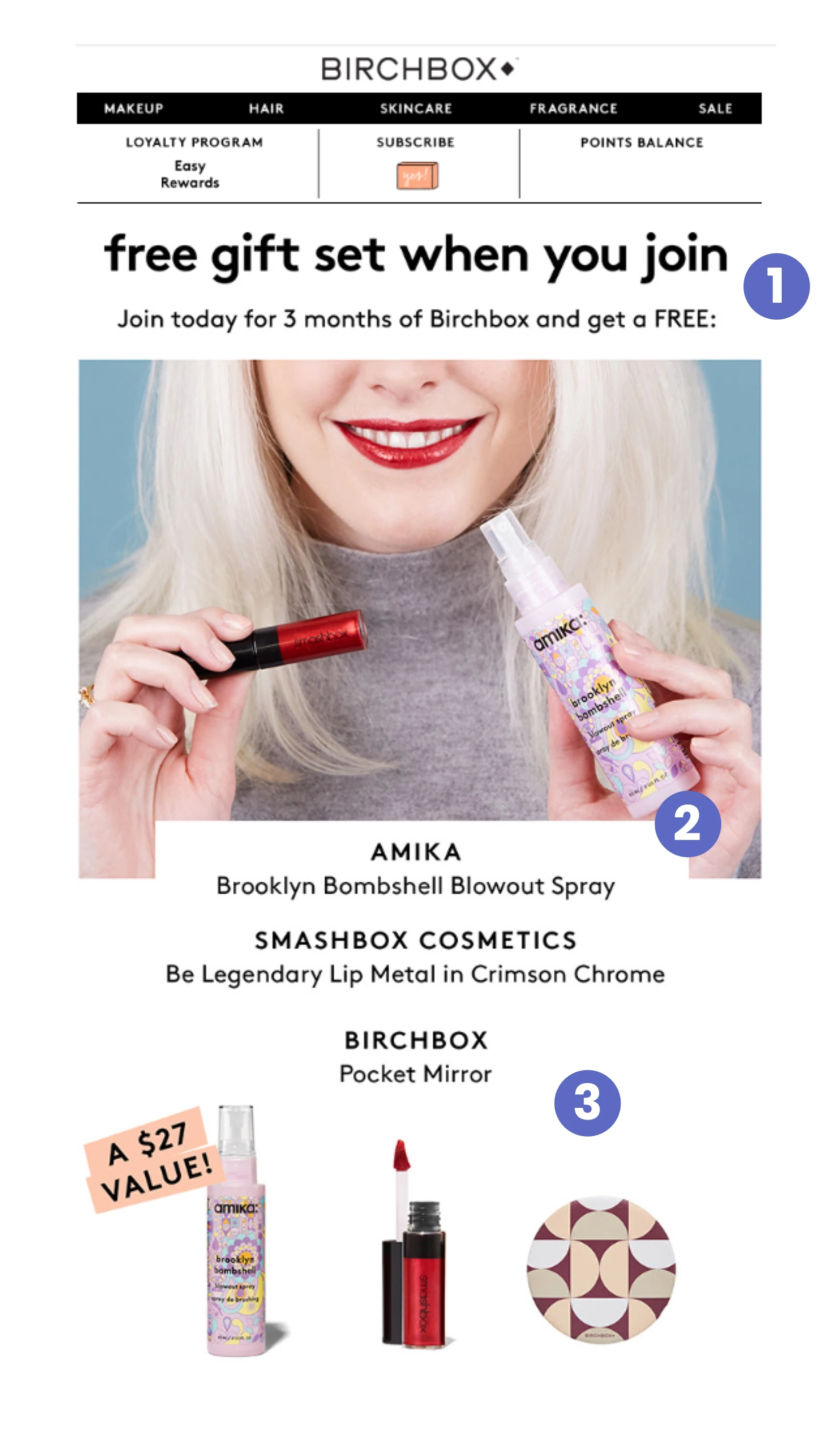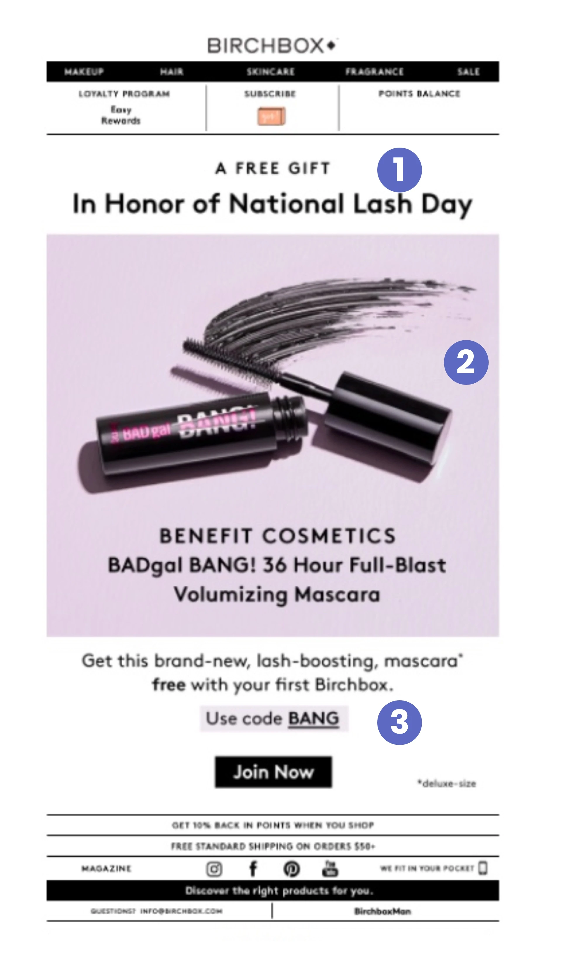 除了聖誕節或情人節等典型的假日營銷機會外,還有像#NationalLashDay 這樣的“社交媒體假期”,您可以通過高度相關的產品促銷來跳槽。 在這種情況下,Birchbox 會在您購買時免費贈送睫毛膏。