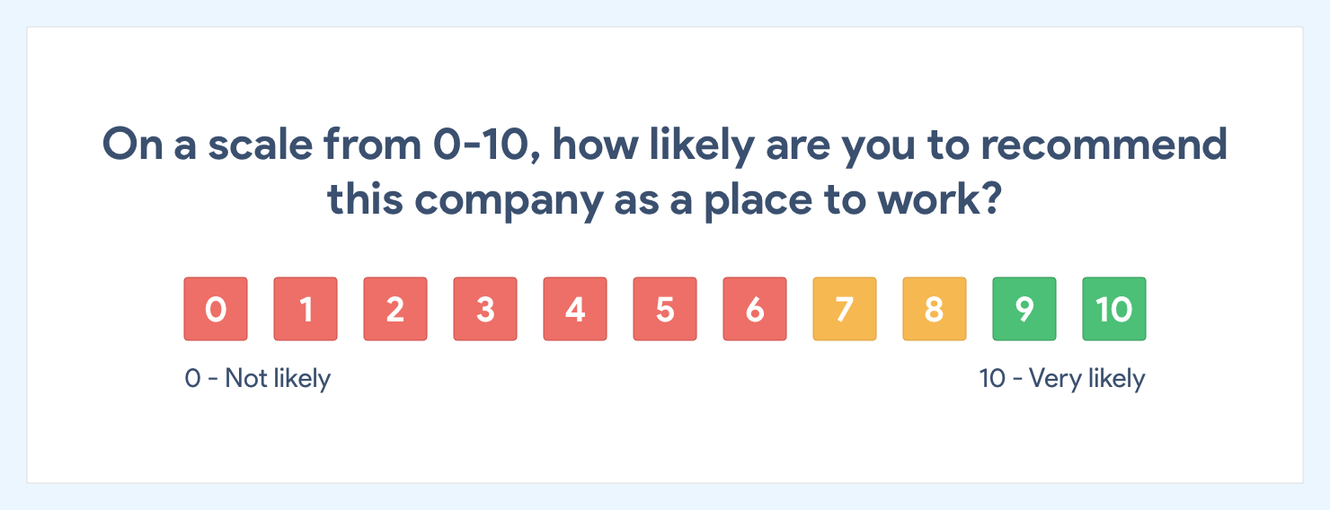 這些快速、簡短的調查提出的問題可以在 0 到 10 的範圍內進行衡量,以將員工敬業度和滿意度轉化為指標。 然後,公司將“推薦者”(正面)和“批評者”(負面)相加得出分數。