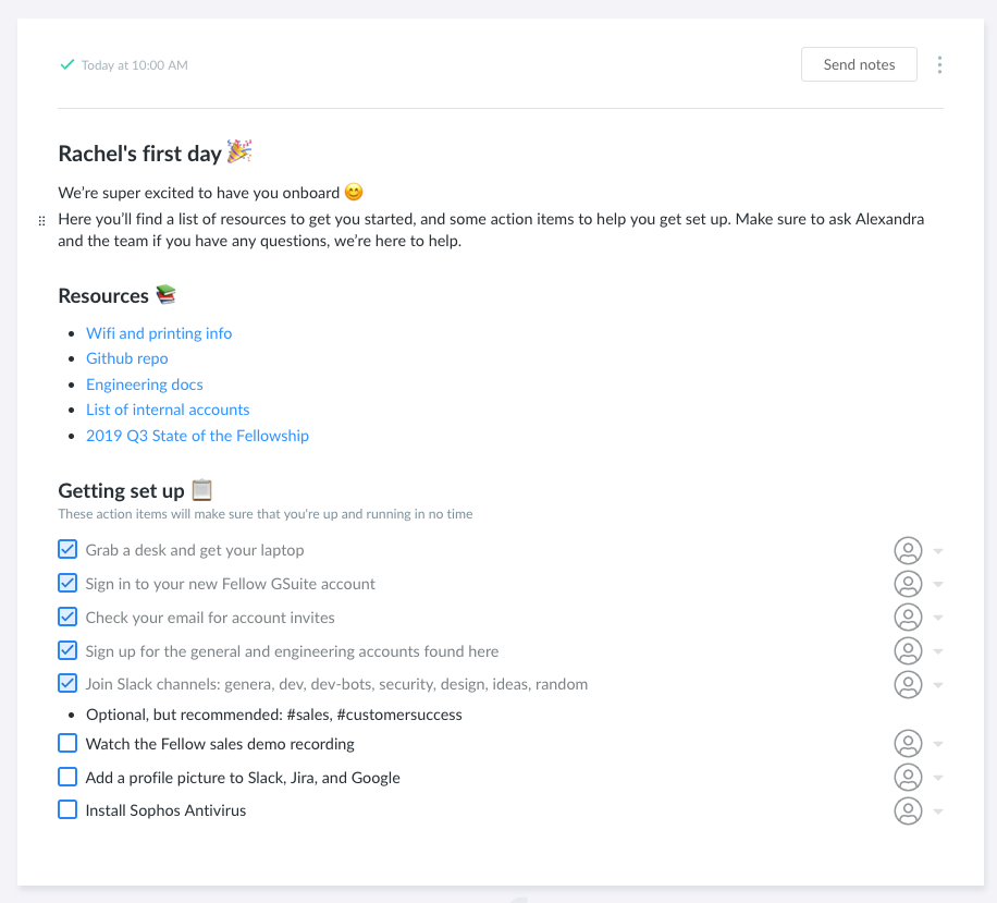 例如,Fellow 的團隊使用他們自己的協作軟件來歡迎新員工並讓他們開始工作。 它們包括在整個清單中熟悉組織其他成員的資源和機會。