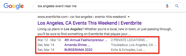在您的網站頁面上包含結構化資料或架構標記。 它是描述 Google 在 SERP 中顯示的頁面內容的程式碼,例如事件的架構標記: