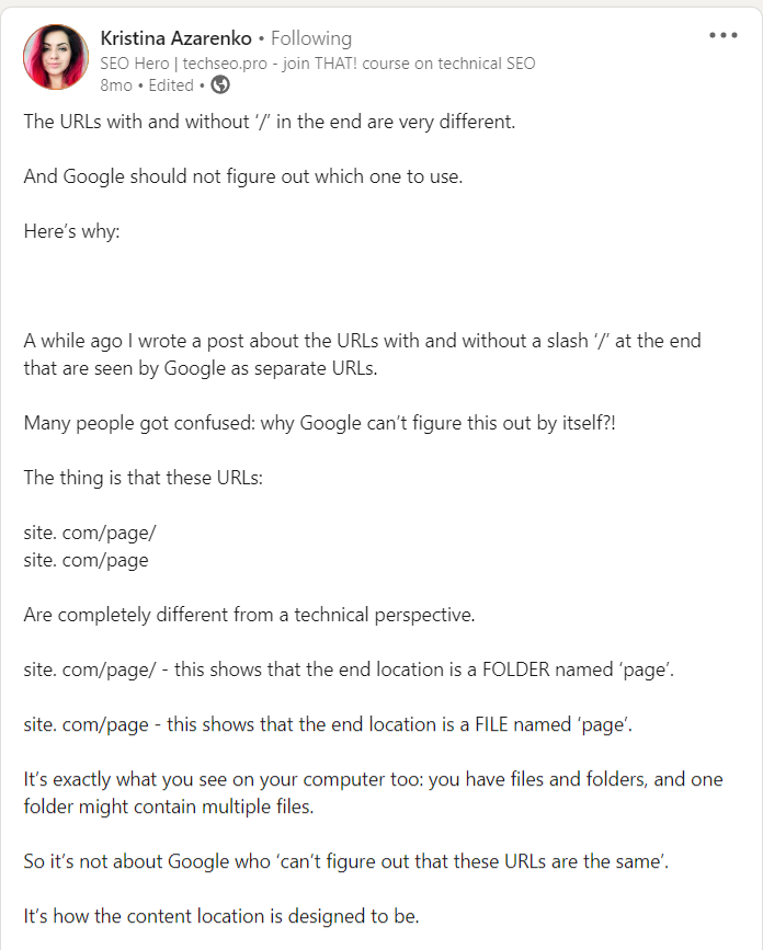 另外,請注意 URL 中反斜線 (/) 的作用。 URL 末尾的反斜線表示該頁面是一個資料夾,沒有反斜線的頁面表明它是一個檔案名稱。 因此,請確保使用反斜線讓 Google 知道您網站頁面的位置: