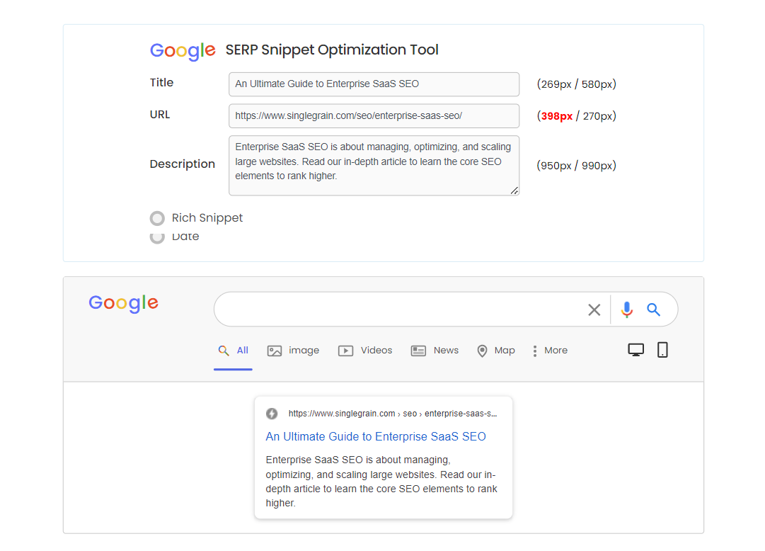 使用此 SERP 預覽工具可在行動裝置和桌面裝置上預覽 SERP 中的 URL、元標題和描述: