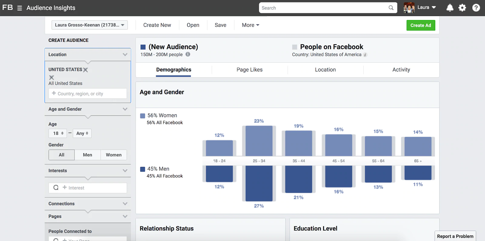 您可能希望從興趣、行為和人口統計數據中的所有可用選項中測試幾個受眾。 Audience Insights 工具可以幫助您縮小這些選項的範圍並確定要測試的類別。