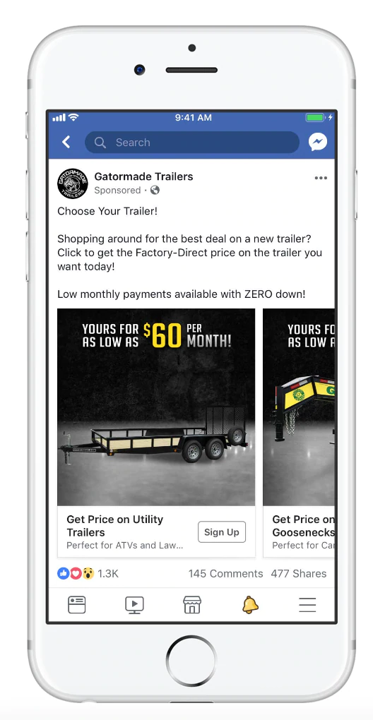 - 顯示使用您的產品的人的圖像。 當人們滾動瀏覽他們的提要時,他們看到的是朋友和家人的照片和視頻。 如果您想讓他們對您的廣告感興趣,請使用展示人們從您的產品中受益的創意——就像他們每天從他們的網絡中看到的一樣。 如果您想包含產品的獨立產品照片或視頻,請使用輪播廣告讓人們可以選擇他們想看的內容。