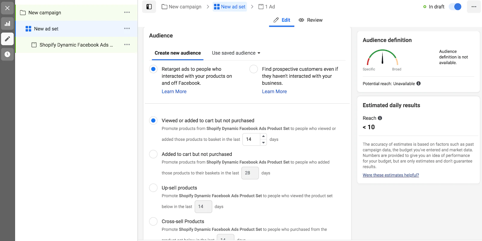如果使用“購買轉化”目標進行潛在客戶並沒有為您的企業帶來銷售,那麼選擇一個成本更低、渠道更高的目標(例如流量或添加到購物車)可以創建一個潛在客戶列表,以便在第二個廣告系列中重新定位。 這將有效地為您的 Facebook 廣告創建一個漏斗,您可以在其中為每個目標受眾提供不同類型的創意,將潛在客戶帶回您的網站以完成購買。