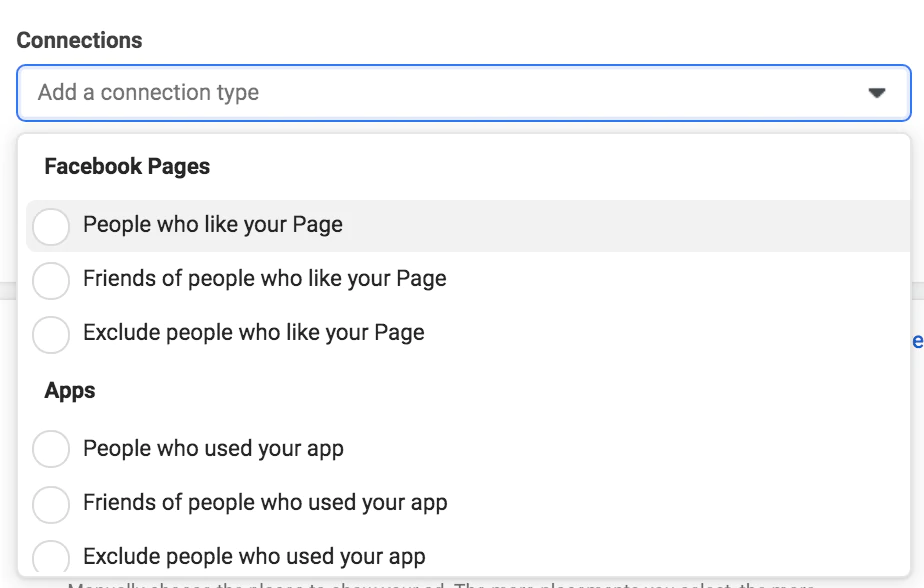 在廣告組級別,您還可以通過點擊喜歡您的業務頁面、應用程序或活動的人以及他們的朋友列表來基於 Connections 來定位人。 如果您有大量屬於這些類別的人,則基於連接的定位可以將您的廣告展示在大量潛在受眾面前。