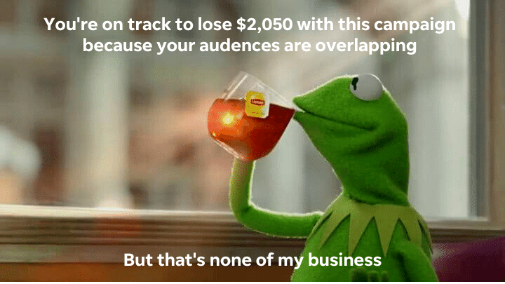 這讓我想到了示例 #1 的另一個問題——許多人會將多個受眾組合到一個廣告組中。 Facebook 鼓勵這種整合,因為它可以吸引更多的受眾,讓你更快地走出學習期。 但是,我喜歡採用更精細的方法,尤其是在預算較小的情況下。 這使我可以更嚴格地控制優化,我將在帖子中進一步討論。