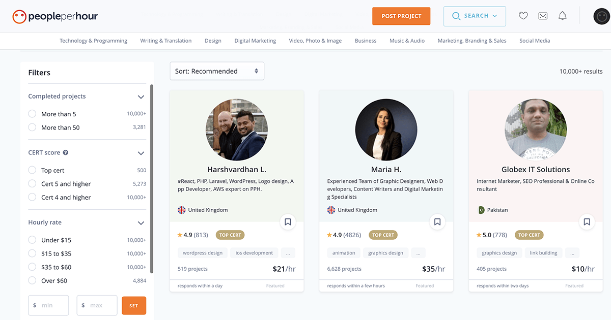 該站點可幫助您與各行各業的自由職業者建立聯繫。 People Per Hour 還根據工作經歷和與其他企業的互動對“賣家”進行評分和排名。