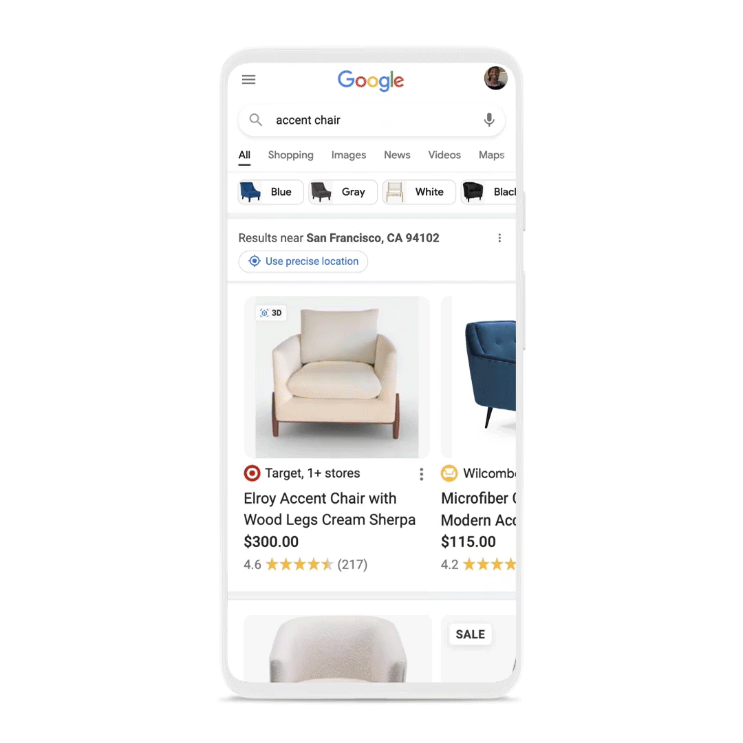即將搜索結果:產品的 3D 模型。 根據谷歌的說法,“攝像頭上的增強現實 (AR) 讓我們更加親近,購物者已經做好了準備。 超過 90% 的美國人目前使用或考慮使用 AR 進行購物。”