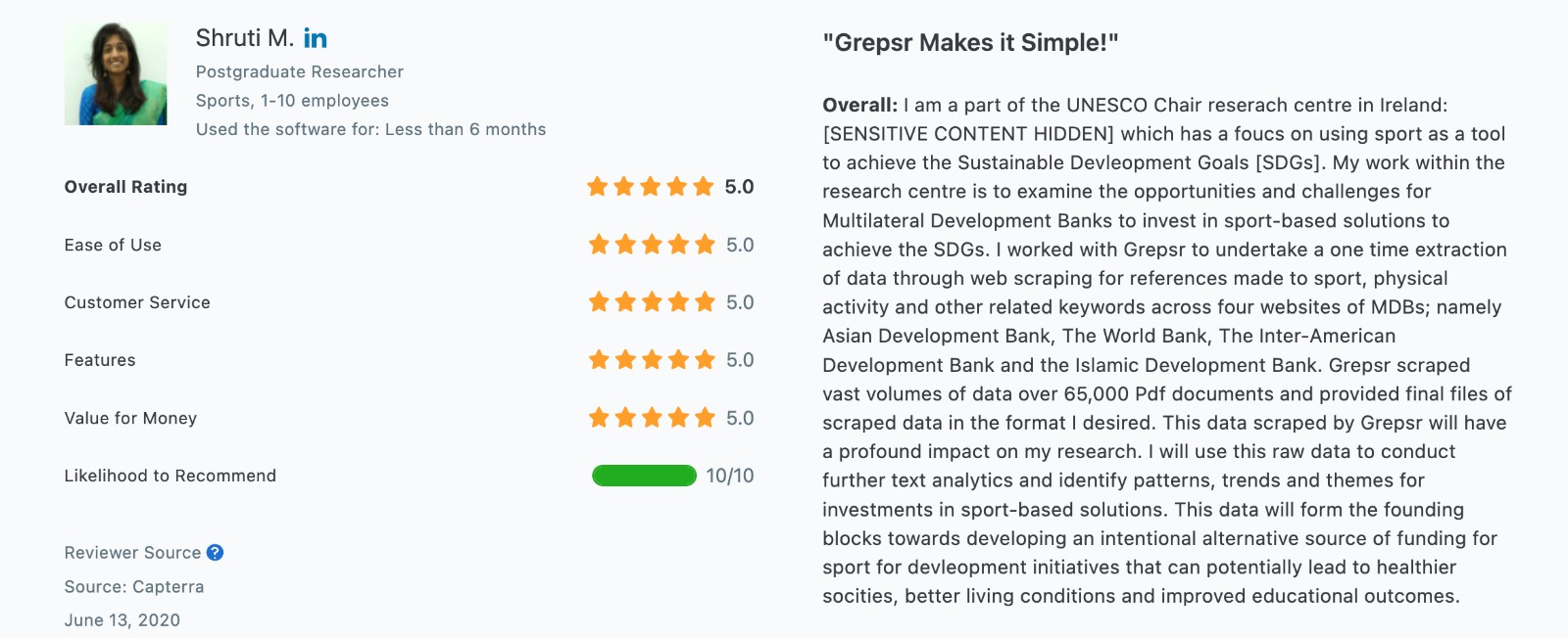 在 Grepsr,他們了解及時交付的重要性。 他們會快速回复客戶的詢問,並花時間了解他們的要求,以便在截止日期前儘早交付數據。