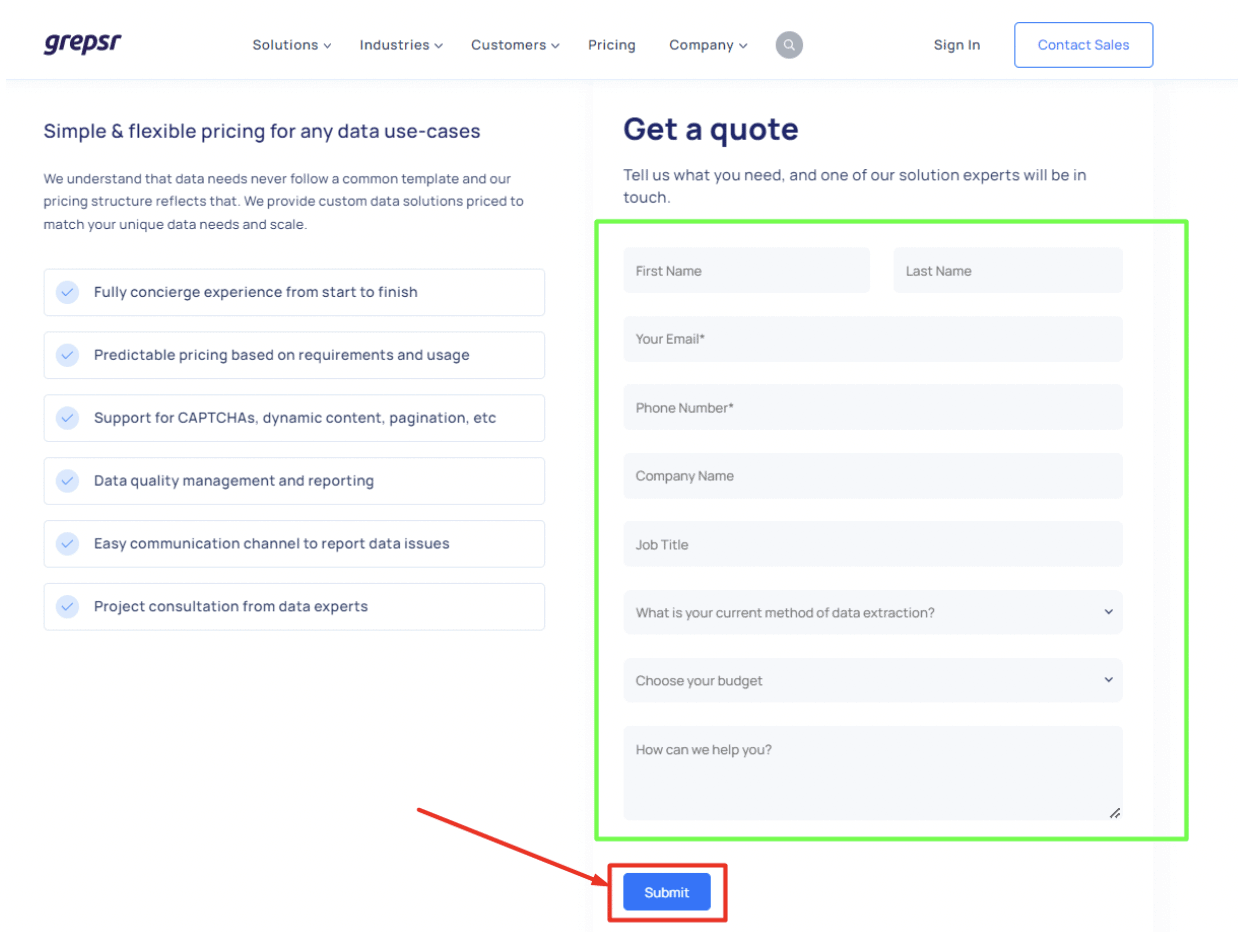 他們還特別關注數據、質量和準確性。 您需要做的就是提供所需數據的精確描述,Grepsr 的團隊將處理您的請求。