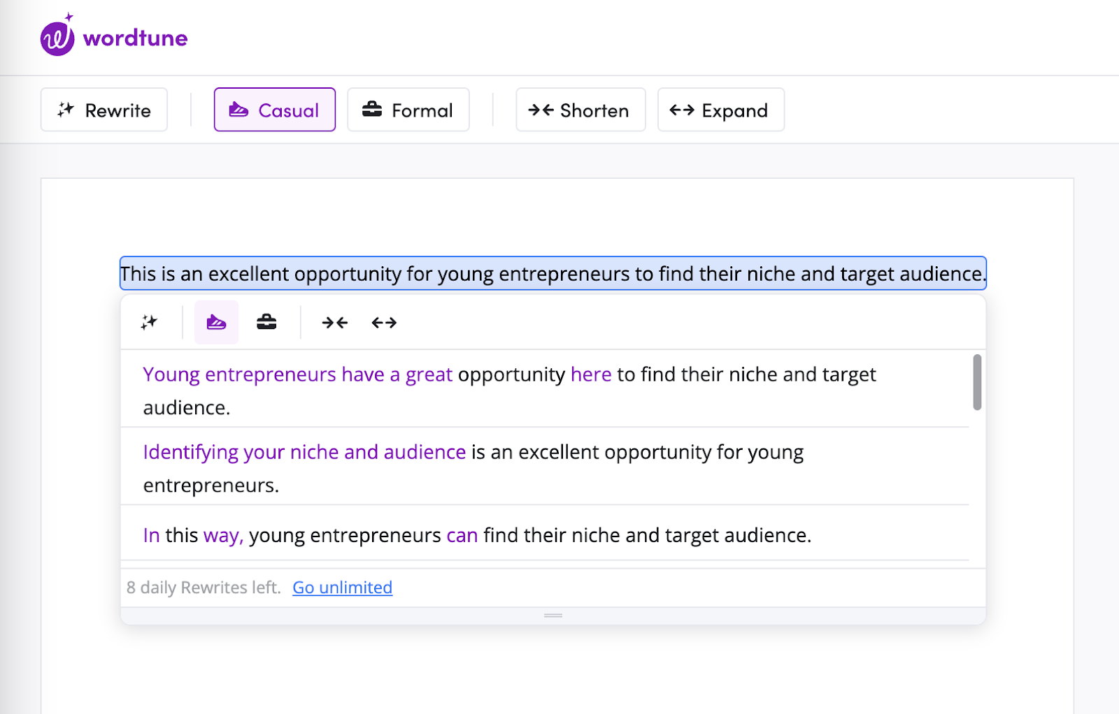 Wordtune 是一款人工智慧寫作助手,可協助完善並提升書面內容的品質。 它提出了不同的措詞和結構句子的方法。