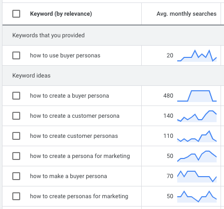 例如,Google 的關鍵字規劃器展示了特定受眾如何每月僅產生 20 次關於“如何使用買家角色”的搜索,而關於如何創建買家角色的搜索次數則超過 480 次!