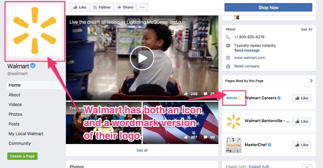 這是沃爾瑪的一個例子。 他們在他們的 Facebook 個人資料照片中使用方形圖標,但他們也有一個矩形字標——為了保持一致性,他們在其他地方使用了這個圖標。