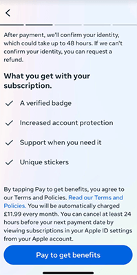 您可以在網路上以 11.99 美元購買每月 Meta Verified 訂閱,在 iOS 和 Android 上購買每月 14.99 美元。 除了藍色徽章驗證之外,它還具有其他好處,包括擴大覆蓋範圍和知名度、獨家貼紙和每月 100 顆星。