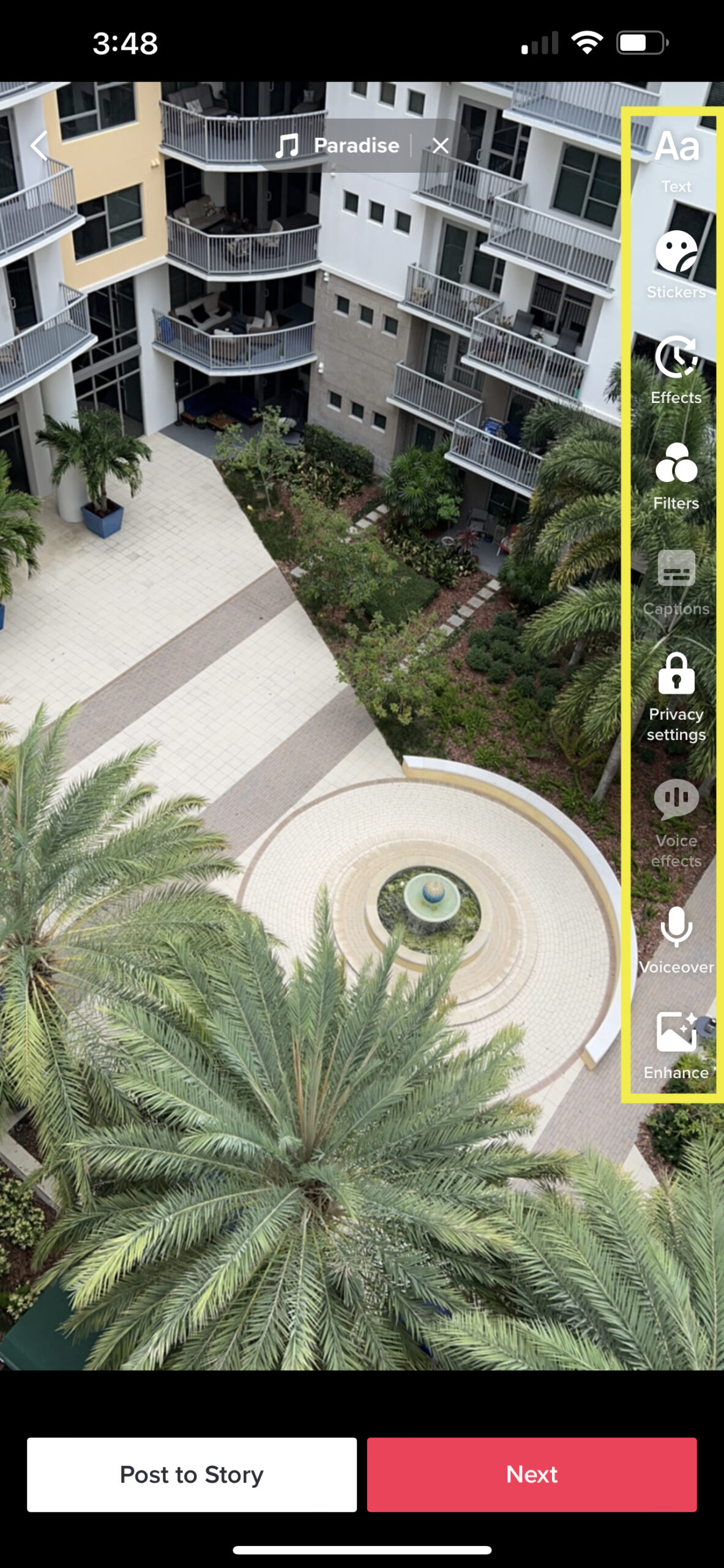 第 3 步:上傳要在 TikTok 中使用的一個或多個視頻後,您可以像以前一樣選擇對其進行自定義。 使用右側面板中的工具為視頻添加文本、貼紙、畫外音、過濾器、語音效果、字幕和效果。 您還可以從 TikTok 音頻庫為視頻添加聲音。