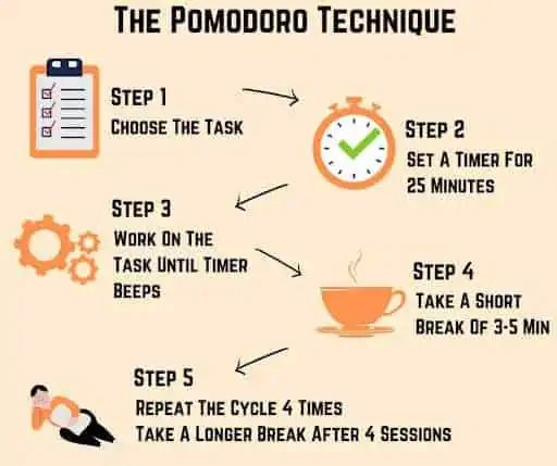 關鍵是把你的注意力從工作中移開,讓它進入一種放鬆的狀態。 休息結束後,重新開始工作。 經常安排短暫的休息時間會讓你精神煥發。 您還可以為此使用稱為番茄工作法的時間管理策略。 它包括在一項任務上工作 25 分鐘,然後休息 5 分鐘。 這可以重複 4 次,之後您將休息 20-30 分鐘。