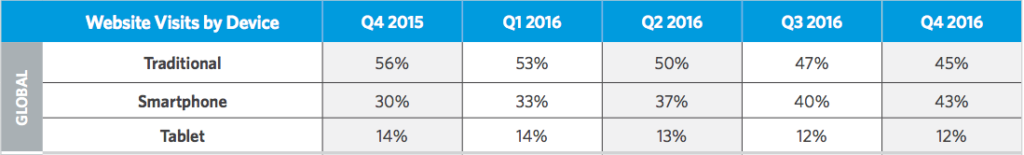 移動流量正在超越台式機,但轉化率似乎未能跟上這一趨勢。 來自智能手機的轉化(同樣根據 2016 年第四季度 Monetate 電子商務季度報告)仍然低於桌面網站和平板電腦(事實表明小幅增長)。