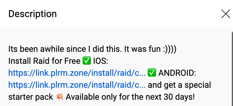然而,一個更常見的Raid廣告位是 YouTube。 除了投放常規的YouTube 視頻廣告之外, Raid還採用了更具創意的方法,並贊助了 YouTube 知名人士的各種視頻——以至於它成為贊助商的頻率已經成為一個笑話。