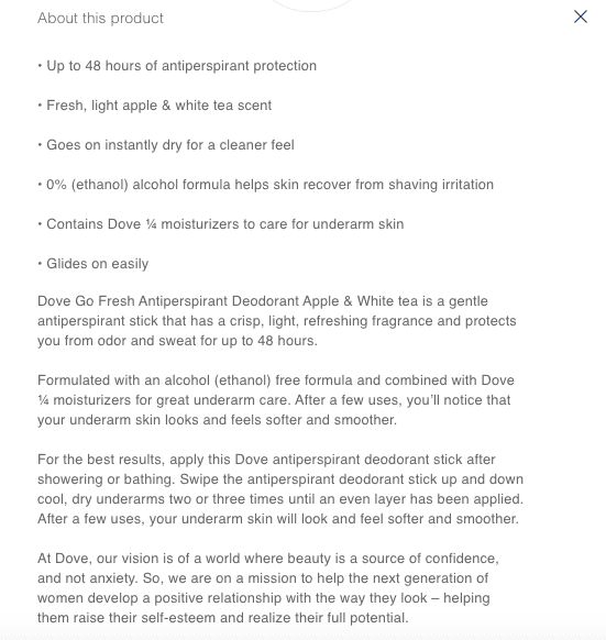 現在將其與 Dove 的一種除臭劑的產品說明進行比較。