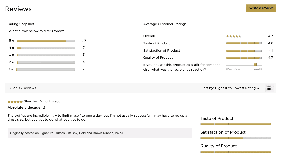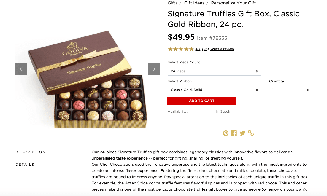 如今,許多品牌在其產品頁面上都包含一個評級欄——一種快速而簡單的視覺效果,可以作為社會證明。 例如,看看巧克力公司 Godiva。
