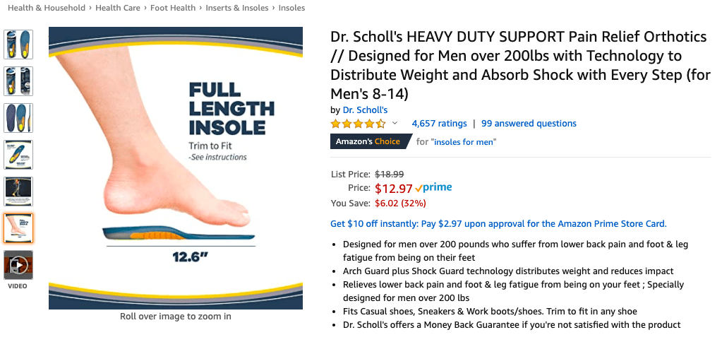 根據您的產品,您還可以使用圖表或視頻,如果您的銷售需要一些解釋,這將特別有用。 也就是說,只使用對您的產品有意義的媒體類型。 例如,無需為 T 卹創建圖表,但它可能對提供足弓支撐的鞋墊有所幫助,例如 Dr. Scholl 的產品。