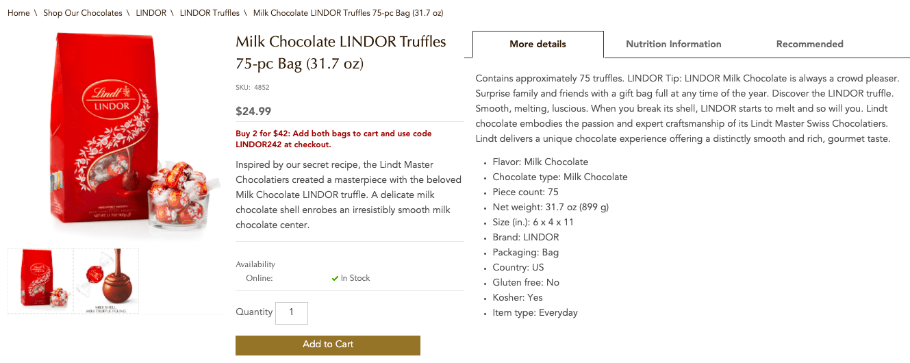 與其競爭對手 Godiva 不同,Lindt 採取了一種更簡單的方法,即在產品描述中宣傳其松露的受歡迎程度。 諸如“寵兒”和“總是討人喜歡”之類的詞語和短語有助於強調它的牛奶巧克力松露是巧克力商最受歡迎的,無論在什麼場合。
