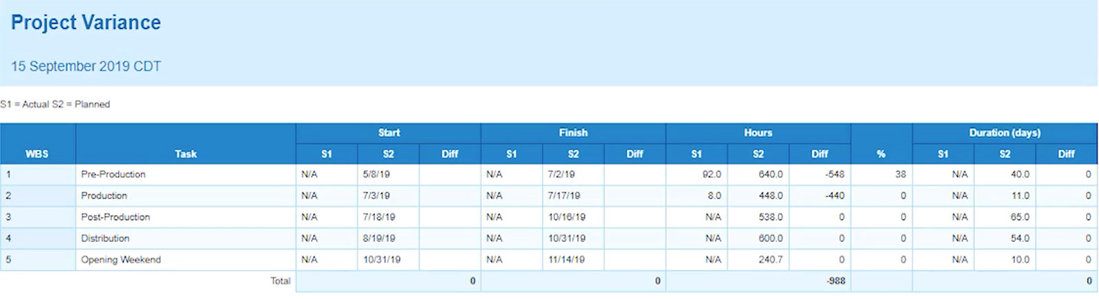 可以自定義差異報告以僅包含摘要任務、完成百分比以及項目實際進度與預測進度的比較:
