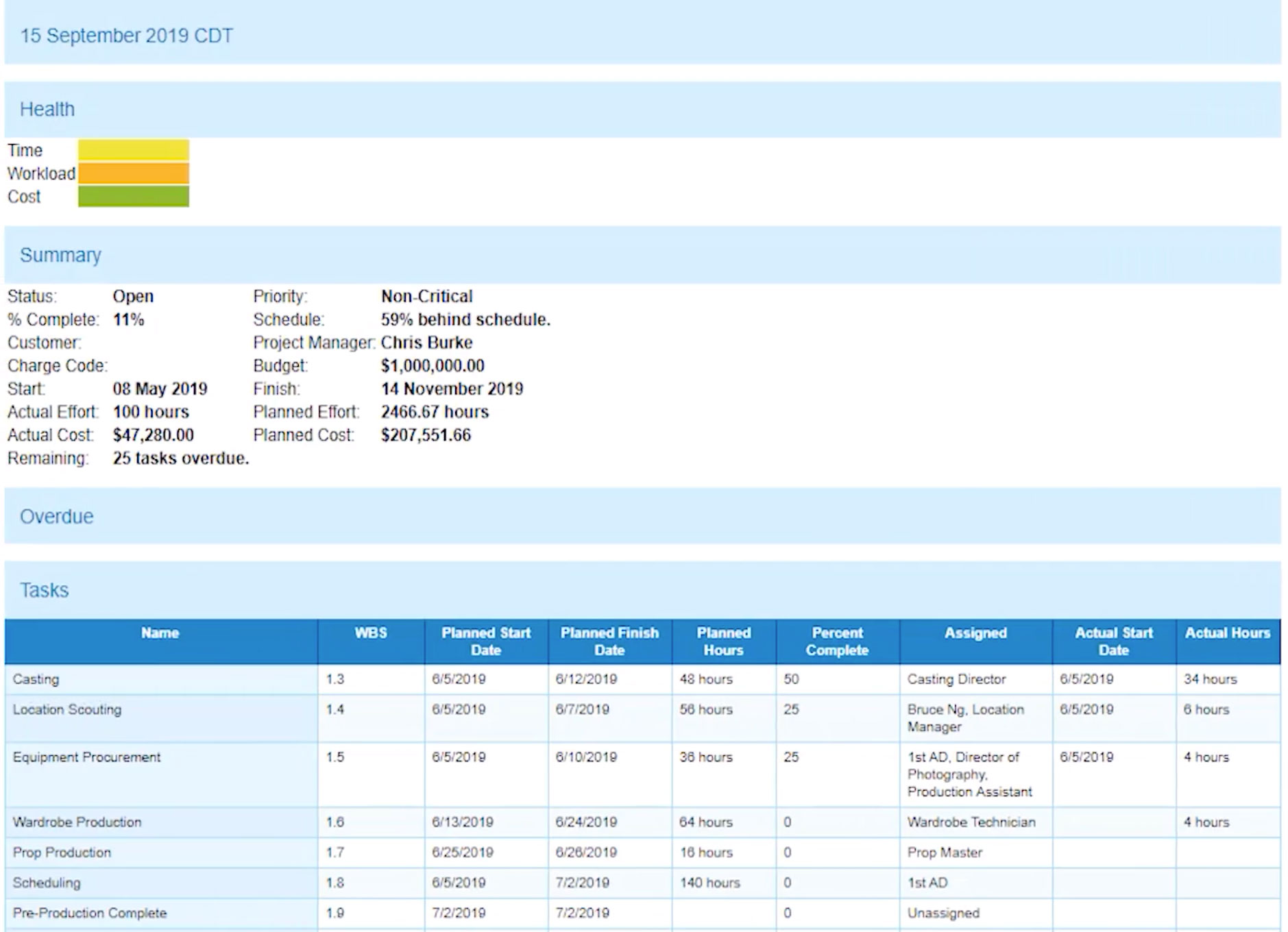 下面是一個項目狀態報告示例,該報告可以使用多個變量生成,包括工作分解結構 (WBS)、計劃開始和完成日期、計劃小時數、完成百分比、任務分配、開始日期和實際小時數: