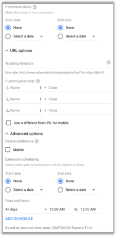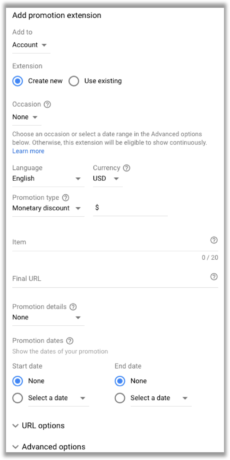 同樣,找出促銷擴展的最佳方法是在設置視圖中嘗試並使用您的廣告測試不同的功能。 但是,需要注意的是貨幣、促銷類型、項目和最終 URL 都是必需的。 其餘的可以根據廣告客戶的偏好進行定制。 這些術語不應與您在帳戶中已經使用的術語差別太大。
