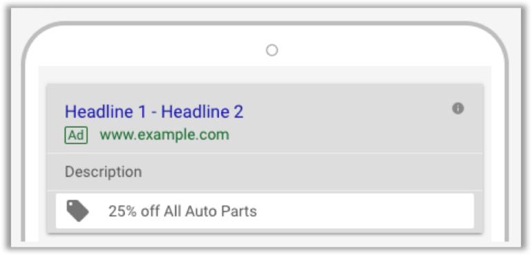在我深入了解是什麼讓促銷擴展變得偉大之前,讓我們首先解決它到底是什麼。 以前,它們僅作為測試版提供。 現在,在新的 AdWords 界面中,每個廣告客戶都可以使用它們。 該擴展程序為您的廣告添加了另一行促銷信息。 但是,它們必須特定於折扣或優惠(即貨幣折扣、百分比折扣、價格限定詞等)。 除此之外,廣告商還可以選擇顯示促銷代碼、場合、日期和/或訂單金額限定符。