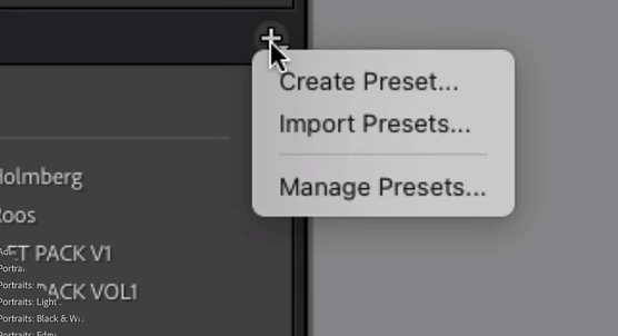 為此,請單擊預設面板上的+圖標,然後單擊創建預設。
