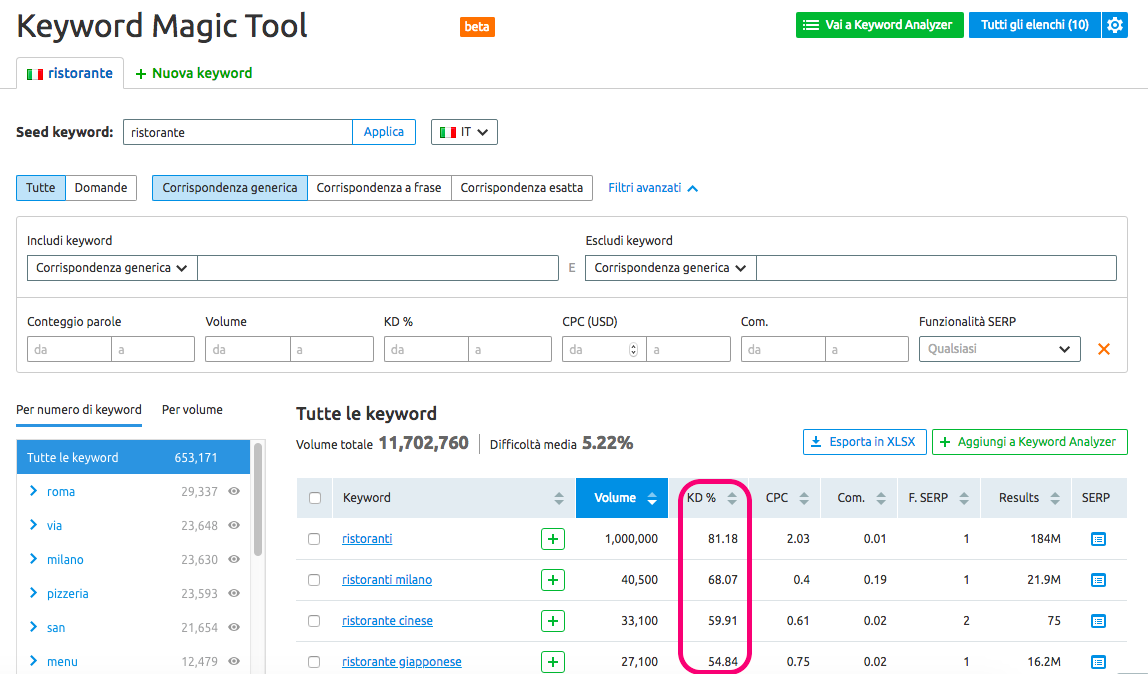 一個白手起家的公司應該避免立即關注最具競爭力的關鍵詞,或者那些搜索量最高但關鍵詞難度最大的關鍵詞; SEMrush 的 Keyword Magic 工具準確地指出了這個值,讓 SEO 意識到要獲得比競爭對手更好的關鍵字排名是多麼困難。