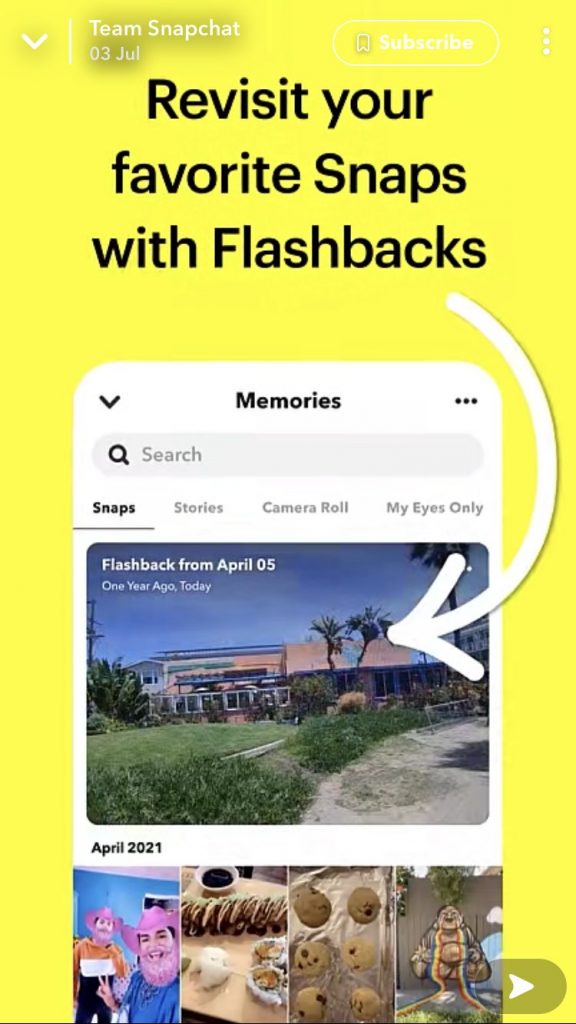 例如,借助 Flashback Memories,您可以將其變成#tbt 時刻或慶祝特殊的里程碑和周年紀念日。 這基本上就像您的 Snapchat 回憶的周年紀念日。 Apple 和 Facebook 等品牌使用相同的功能。