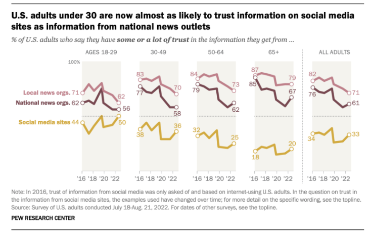 社交媒體也模糊了被認為是“值得信賴”的新來源的界限。 皮尤數據顯示,30 歲以下的成年人對來自社交媒體的新聞的信任程度與傳統媒體一樣多。