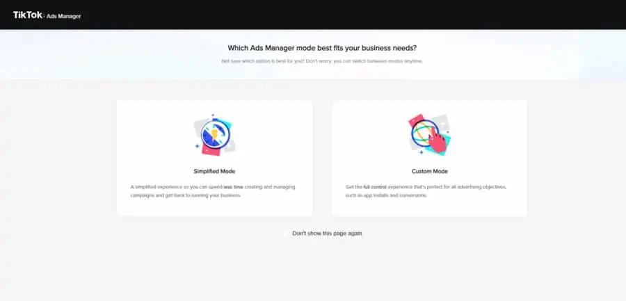 創建 TikTok 廣告時有兩種模式,簡單模式或自定義模式。