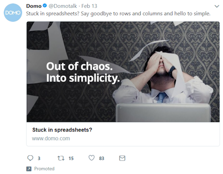 使用 Twitter 網站卡片的優勢非常明顯。 廣告商不僅擁有文字,還擁有完整的圖片來幫助產生點擊率。 該圖像不僅引人注目,而且還是潛在客戶鼠標的重要目標。