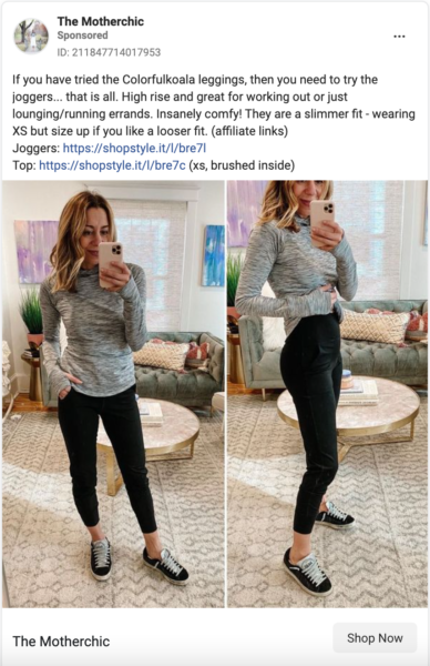 在這種情況下,他們直接通過影響者的 Facebook 頁面重新定位潛在客戶。 這種類型的重新定位通過了真正的推薦,特別是因為它與他們的提要上的其他內容融為一體。 像這樣的廣告讓用戶可以想像自己穿著這件衣服,並看到其他消費者實際使用的產品。