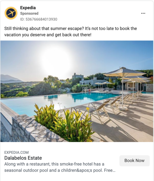Expedia 是一個預訂世界各地航班和住宿的網站。 他們已經重新定位到一門科學。 憑藉 20 多年的經驗,他們了解是什麼讓用戶回來並預訂他們正在尋找的旅行。 看看這個重定向廣告。 他們有幾個版本,在瀏覽完租借後會發送給潛在客戶。 它提醒他們,他們正在尋找的莊園仍然可用,並添加了一個描述,提醒他們這裡的設施。