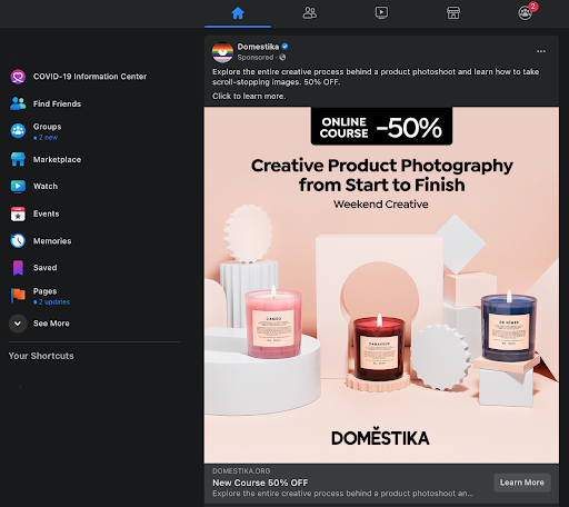 Domestika 是一個創意在線課程平台。 他們提供各種藝術和手工藝課程以及數字技能課程。 他們使用重定向廣告來吸引潛在客戶註冊他們感興趣的課程。在上面的示例中,他們使用 Facebook 重定向廣告為其產品攝影課程提供很大折扣。
