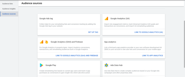在您的廣告帳戶中,轉到共享庫、受眾管理器,然後選擇“受眾來源”。 在那裡,您將單擊“設置標籤”。 選擇您要收集的數據類型並複制代碼。
