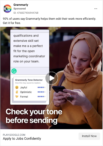 Grammarly 是一個擴展和平台,用於在您寫作時突出顯示和建議更正。 它可以檢測電子郵件、消息和文檔中的錯誤。 Grammarly 的重定向廣告突出了對您最有用的時刻,例如這個 Facebook 廣告提醒您語法錯誤可能意味著找到工作和被拒絕之間的區別。 它有一個明確的“立即安裝”號召性用語 (CTA),並且有助於他們提供免費版本的產品。 這使得稍後將付費版本轉換和推銷給免費用戶變得更加容易。