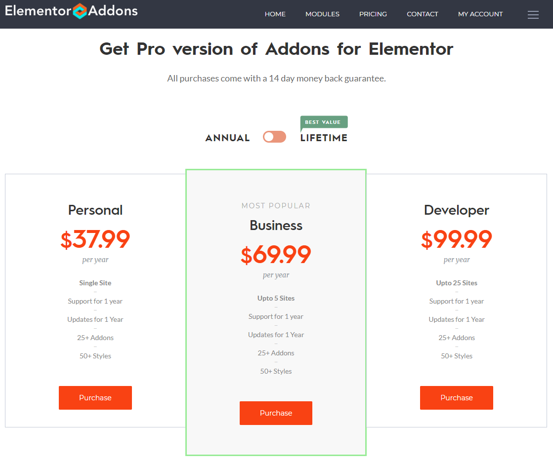 雖然 Elementor Addons 插件似乎確實有一個“最受歡迎的計劃”推薦,但感覺它沒有足夠突出,因此可能實際上並沒有像它應該的那樣溫和地引導人們使用該計劃。 我們建議溫和地突出其邊界,使其更清晰,但不會損害頁面設計。 這是一個快速建議,通過將推薦計劃包裹在綠色邊框中來突出顯示推薦計劃: